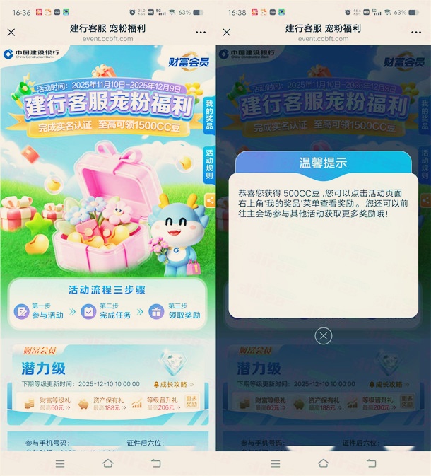 正文 建行客服宠粉福利领最高1500个CC豆 亲测中500豆 5188 V管理员 /今天 /290 阅读 1113 温馨提示:文章均来自网络用户自主投稿,风险性未知,涉及注册投资需谨慎,因此造成损失本站概不负责! 建行举办的宠粉福利领最高1500个CC豆活动,打开微信进去活动里,报名后按照提示去微信公众号绑定账号,就可以回来领取300-1500个CC豆,价值3-15元,CC豆专区不定期上架小额京东卡可以兑换。微信扫下面码进入活动:活动时间:2025年11月10日-12月9日进去报名后按照提示去微信公众号绑定账号,就可以回来领取300-1500个CC豆,价值3-15元,CC豆专区不定期上架小额京东卡可以兑换。投诉/删帖
