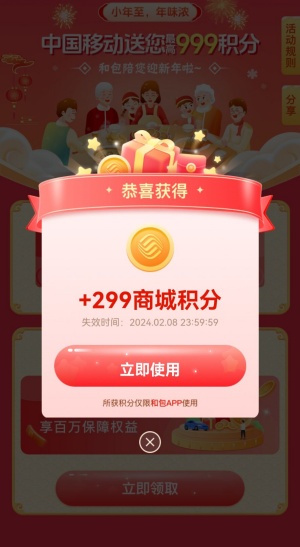 移动和包举办的和包职场守护领最高999个和包积分活动,通过打开和包APP进去活动里,登录后可以直接领到最高999个和包积分,小编测试中到299个积分(价值3元左右),累积得到的和包积分可以在商城里面兑换云闪付红包、支付宝红包等等。