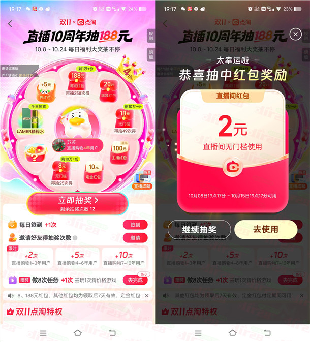 点淘双11抽最高188元无门槛红包 能中多次 可0元撸实物包邮