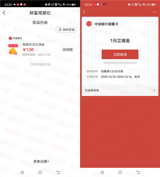 中信银行财富周游记抽1-500元微信立减金 亲测中1元秒到