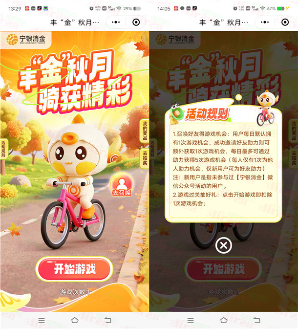 参加宁银金融举办的丰金秋月骑获精彩小游戏抽红包活动,通过打开微信进去活动里,每个微信默认有1次游戏机会,小游戏躲避所有障碍物,达到66KM可抽奖1次,有机会中到0.3-8.88元微信红包,中到的红包目前秒推,非必中。