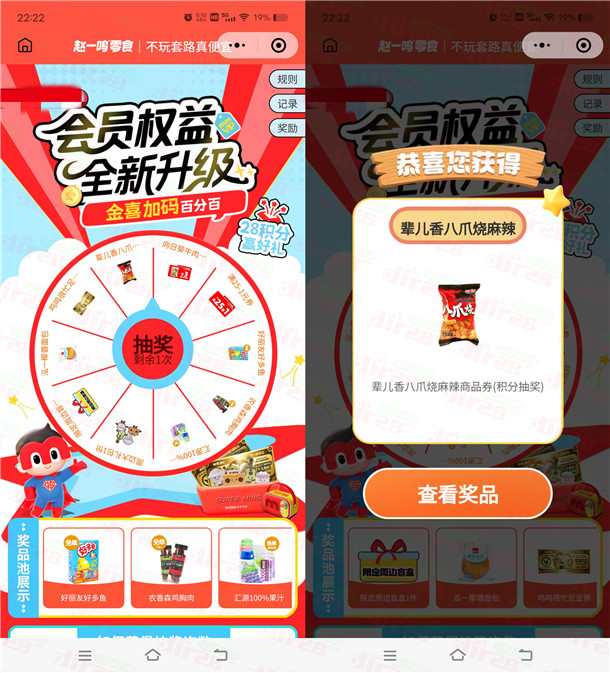 参加赵一鸣举办的会员权益全新升级金喜加码百分百活动,通过打开微信进去赵一鸣小程序活动里,进去签到可以抽奖1次,中到的零食可以去自己线下赵一鸣门店免费领取,非必中。