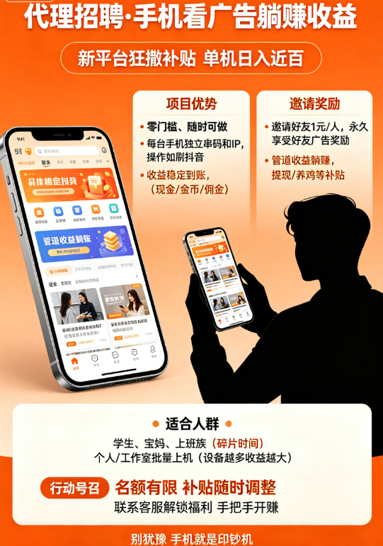 你是不是还在找简单靠谱的兼职?手机看广告收益项目,真正零门槛、随时可做!每台手机独立串码和IP,对接广告代码后,刷刷视频、点点互动,就能拿现金、金币、佣金——操作跟刷抖音一样简单,收益却稳定到账。